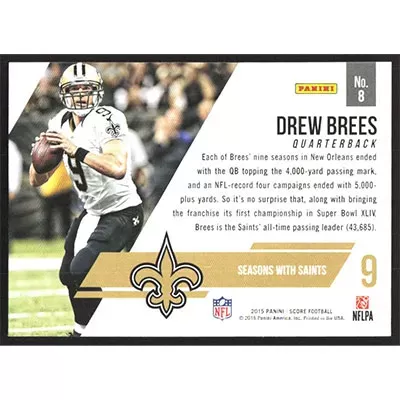 This is a 2015 Score Franchise Drew Brees football card. The card is #8 and pictures show condition.