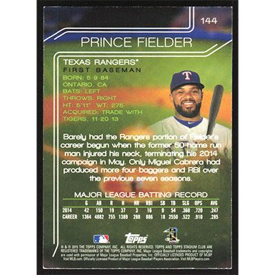 This is a 2015 Stadium Club Prince Fielder baseball card. The card is #144 and pictures show condition.