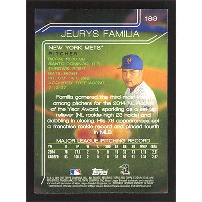 This is a 2015 Stadium Club Jeurys Familia baseball card. The card is #189 and pictures show condition.