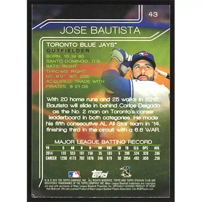 This is a 2015 Stadium Club Jose Bautista baseball card. The card is #43 and pictures show condition.