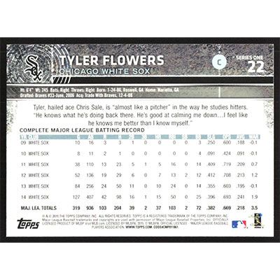 This is a 2015 Topps Tyler Flowers autographed baseball card. This card has been signed, in blue, by Tyler Flowers, and is guaranteed authentic by Ballcardz.com. The card is #22 and pictures show condition.