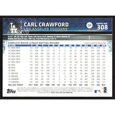 This is a 2015 Topps Carl Crawford baseball card. The card is #308 and pictures show condition.