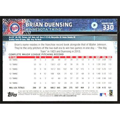 This is a 2015 Topps Brian Duensing baseball card. The card is #330 and pictures show condition.