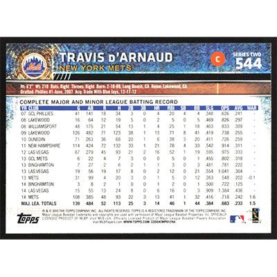 This is a 2015 Topps Travis d'Arnaud Future Stars baseball card. The card is #544 and pictures show condition.
