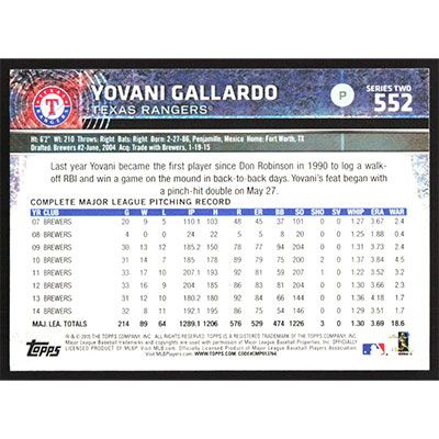 This is a 2015 Topps Yovani Gallardo baseball card. The card is #552 and pictures show condition.