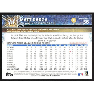 This is a 2015 Topps Matt Garza baseball card. The card is #56 and pictures show condition.