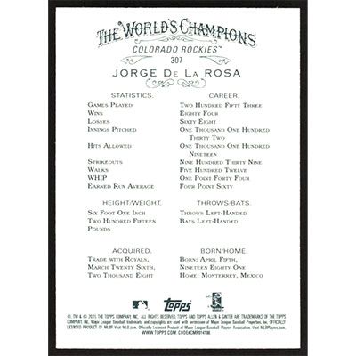 This is a 2015 Topps Allen & Ginter Jorge De La Rosa baseball card. The card is #307 and pictures show condition.
