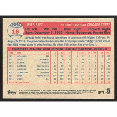 This is a 2015 Topps Archives Javier Baez baseball card. The card is #16 and pictures show condition.