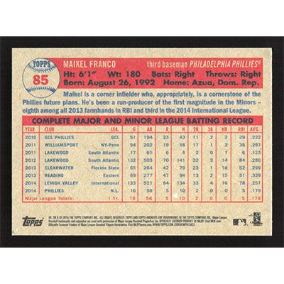 This is a 2015 Topps Archives Maikel Franco baseball card. The card is #85 and pictures show condition. Team(s): Philadelphia Phillies Rookie Card (RC)