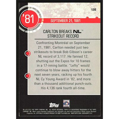 This is a 2015 Topps Baseball History Steve Carlton baseball card. The card is #13B and pictures show condition.