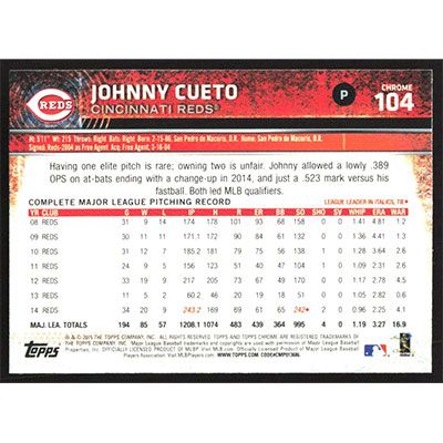 This is a 2015 Topps Chrome Johnny Cueto baseball card. The card is #104 and pictures show condition.