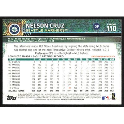 This is a 2015 Topps Chrome Nelson Cruz baseball card. The card is #110 and pictures show condition.