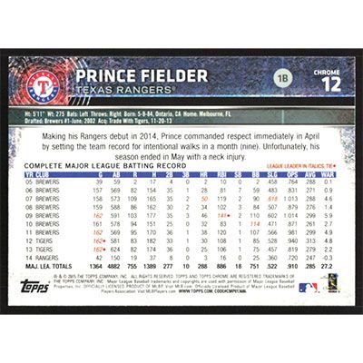 This is a 2015 Topps Chrome Prince Fielder baseball card. The card is #12 and pictures show condition.
