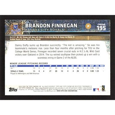 This is a 2015 Topps Chrome Brandon Finnegan baseball card. The card is #195 and pictures show condition. Team(s): Kansas City Royals Rookie Card (RC)
