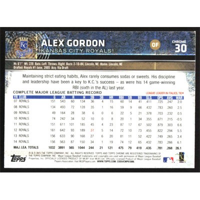 This is a 2015 Topps Chrome Alex Gordon baseball card. The card is #30 and pictures show condition.