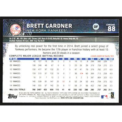 This is a 2015 Topps Chrome Brett Gardner baseball card. The card is #88 and pictures show condition.