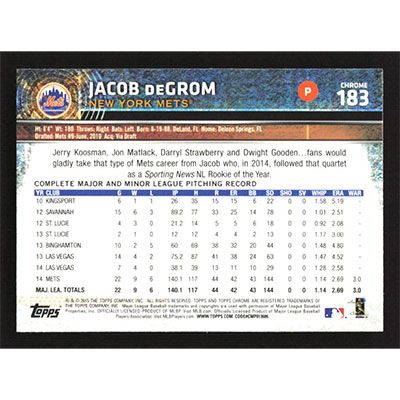 This is a 2015 Topps Chrome Refractors Jacob deGrom baseball card. The card is #183 and pictures show condition.