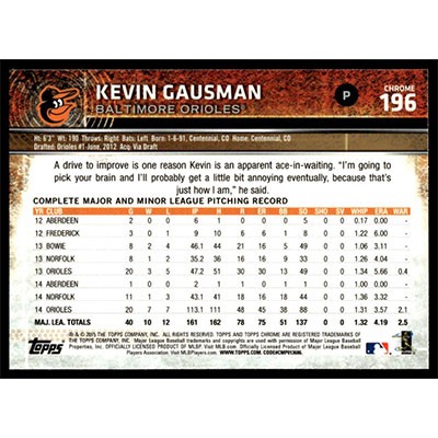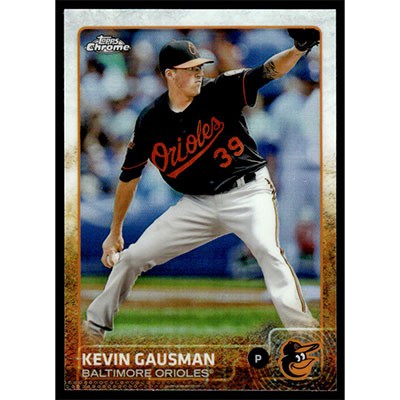 This is a 2015 Topps Chrome Refractors Kevin Gausman baseball card. The card is #196 and pictures show condition.