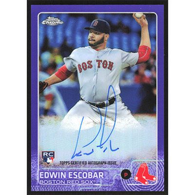 This is a 2015 Topps Chrome Rookie Autographs Purple Refractors Edwin Escobar autographed baseball card. This card has been signed, in blue, by Edwin Escobar, and is and is certified authentic by Topps. The card is #AR-EE and pictures show condition. This card is limited; #'d 125/250.