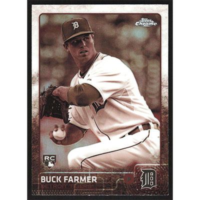 This is a 2015 Topps Chrome Sepia Refractors Buck Farmer baseball card. The card is #171 and pictures show condition. Team(s): Detroit Tigers Rookie Card (RC)