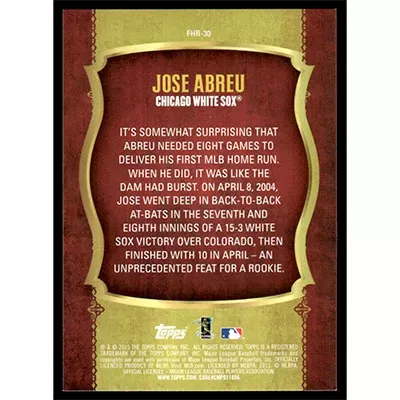 This is a 2015 Topps First Home Run Jose Abreu baseball card. The card is #FHR-30 and pictures show condition.