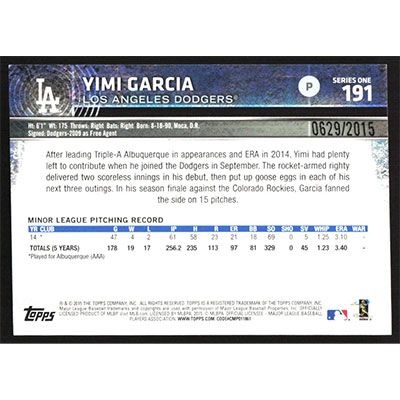 This is a 2015 Topps Gold Yimi Garcia baseball card. The card is #191 and pictures show condition. This card is limited; #'d 0629/2015. Team(s): Los Angeles Dodgers Rookie Card (RC)