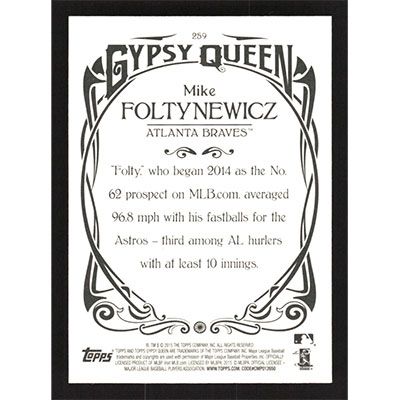 This is a 2015 Topps Gypsy Queen Mike Foltynewicz autographed baseball card. This card has been signed, in blue, by Mike Foltynewicz, and is guaranteed authentic by Ballcardz.com. The card is #259 and pictures show condition.
