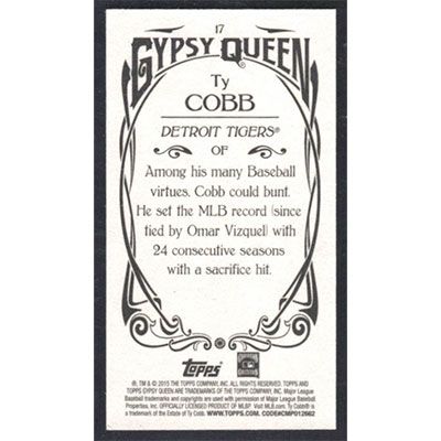 This is a 2015 Topps Gypsy Queen Mini Ty Cobb baseball card. The card is #17 and pictures show condition.
