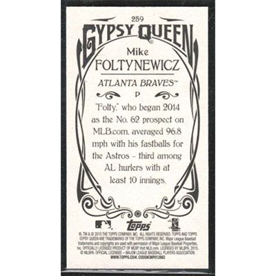 This is a 2015 Topps Gypsy Queen Mini Mike Foltynewicz baseball card. The card is #259 and pictures show condition. Team(s): Atlanta Braves Rookie Card (RC)