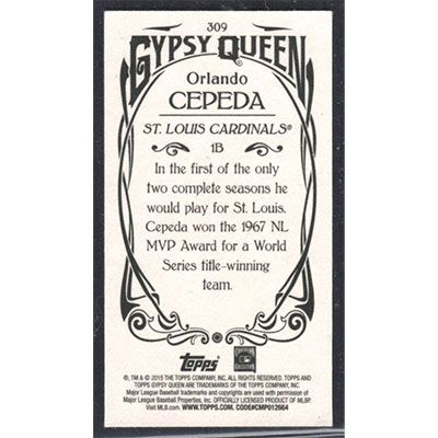 This is a 2015 Topps Gypsy Queen Mini Orlando Cepeda SP baseball card. The card is #309 and pictures show condition.