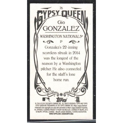 This is a 2015 Topps Gypsy Queen Mini Gio Gonzalez baseball card. The card is #76 and pictures show condition.