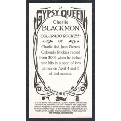 This is a 2015 Topps Gypsy Queen Mini Charlie Blackmon baseball card. The card is #78 and pictures show condition.