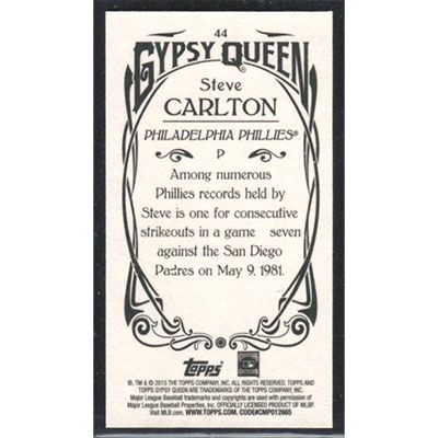 This is a 2015 Topps Gypsy Queen Mini Box Variations Steve Carlton baseball card. The card is #44 and pictures show condition. Team(s): Philadelphia Phillies