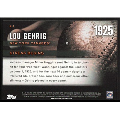 This is a 2015 Topps Highlight of the Year Lou Gehrig baseball card. The card is #H-1 and pictures show condition.