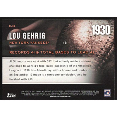 This is a 2015 Topps Highlight of the Year Lou Gehrig baseball card. The card is #H-62 and pictures show condition.