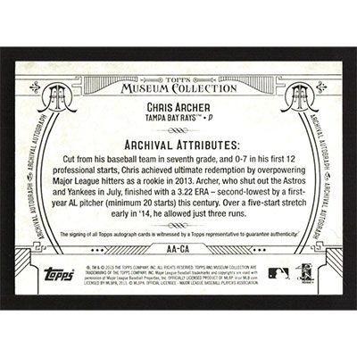 This is a 2015 Topps Museum Collection Archival Autographs Chris Archer autographed baseball card. This card has been signed, in blue, by Chris Archer, and is certified authentic by Topps. The card is #AA-CA and pictures show condition. This card is limited; #'d 252/399.