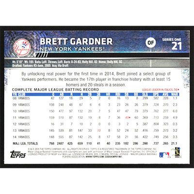 This is a 2015 Topps Brett Gardner baseball card. The card is #NYY-3 and pictures show condition.