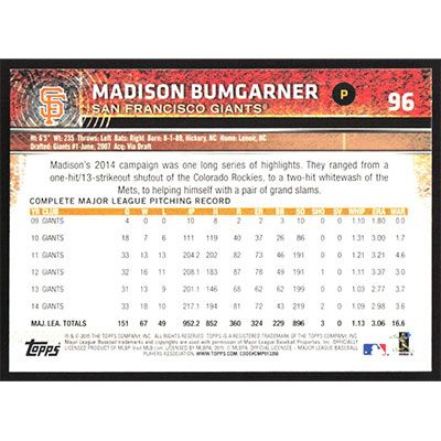 This is a 2015 Topps Opening Day Madison Bumgarner baseball card. The card is #96 and pictures show condition.