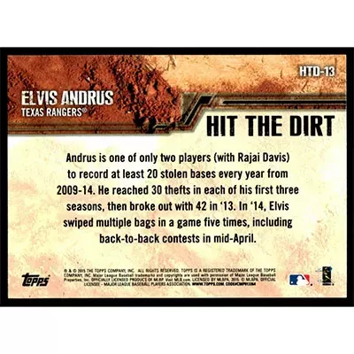 This is a 2015 Topps Opening Day Hit The Dirt Elvis Andrus baseball card. The card is #HTD-13 and pictures show condition.