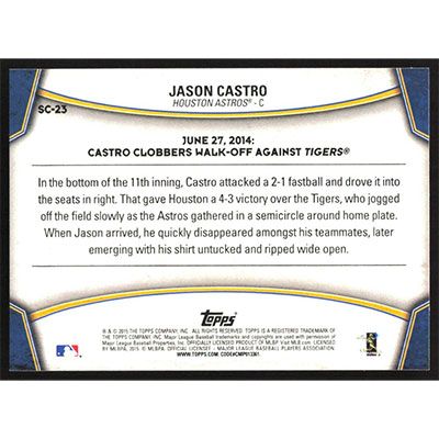 This is a 2015 Topps Opening Day Superstar Celebrations Jason Castro baseball card. The card is #SC-23 and pictures show condition. Team(s): Houston Astros