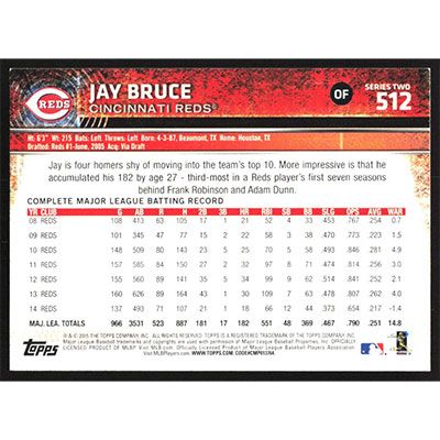 This is a 2015 Topps Rainbow Foil Jay Bruce baseball card. The card is #512 and pictures show condition.