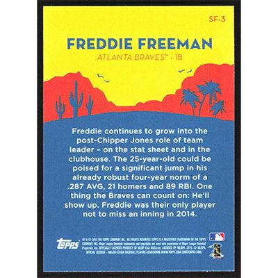 This is a 2015 Topps Spring Fever Freddie Freeman baseball card. The card is #SF-3 and pictures show condition.