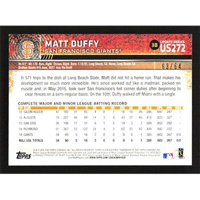 This is a 2015 Topps Update Black Matt Duffy Future Stars baseball card. The card is #US272 and pictures show condition. This card is limited; #'d 63/64.