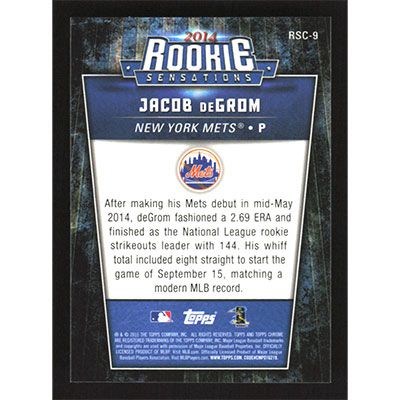 This is a 2015 Topps Update Chrome Rookie Sensations Jacob deGrom baseball card. The card is #RSC-9 and pictures show condition.