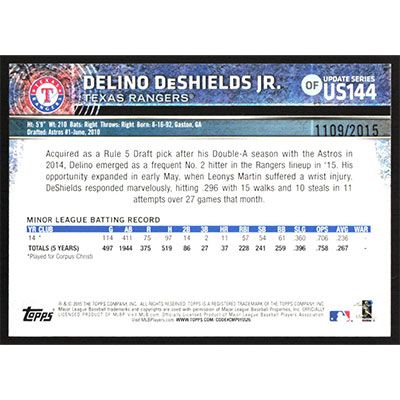 This is a 2015 Topps Update Gold Delino DeShields Jr. baseball card. The card is #US144 and pictures show condition. This card is limited; #'d 1109/2015.