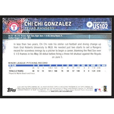 This is a 2015 Topps Update Chi Chi Gonzalez baseball card. The card is #US102 and pictures show condition.