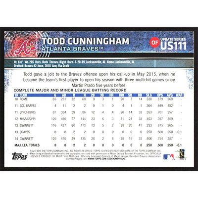 This is a 2015 Topps Update Todd Cunningham baseball card. The card is #US111 and pictures show condition.