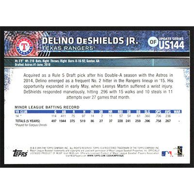 This is a 2015 Topps Update Delino DeShields Jr. baseball card. The card is #US144 and pictures show condition. Team(s): Texas Rangers Rookie Card (RC)