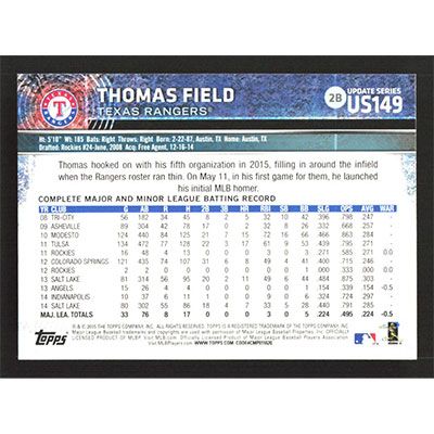 This is a 2015 Topps Update Thomas Field baseball card. The card is #US149 and pictures show condition.