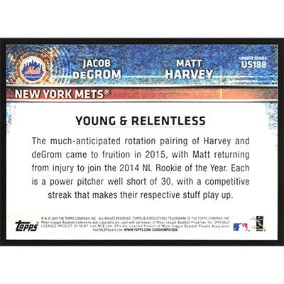 This is a 2015 Topps Update Jacob deGrom and Matt Harvey Young & Relentless baseball card. The card is #US188 and pictures show condition. Team(s): New York Mets